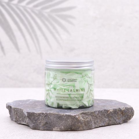 Exquisite White Jasmine Whipped Soap - Immerse yourself in the captivating blend of tart gooseberries and delicate white tea while treating your skin to a luxurious and rejuvenating bathing experience.