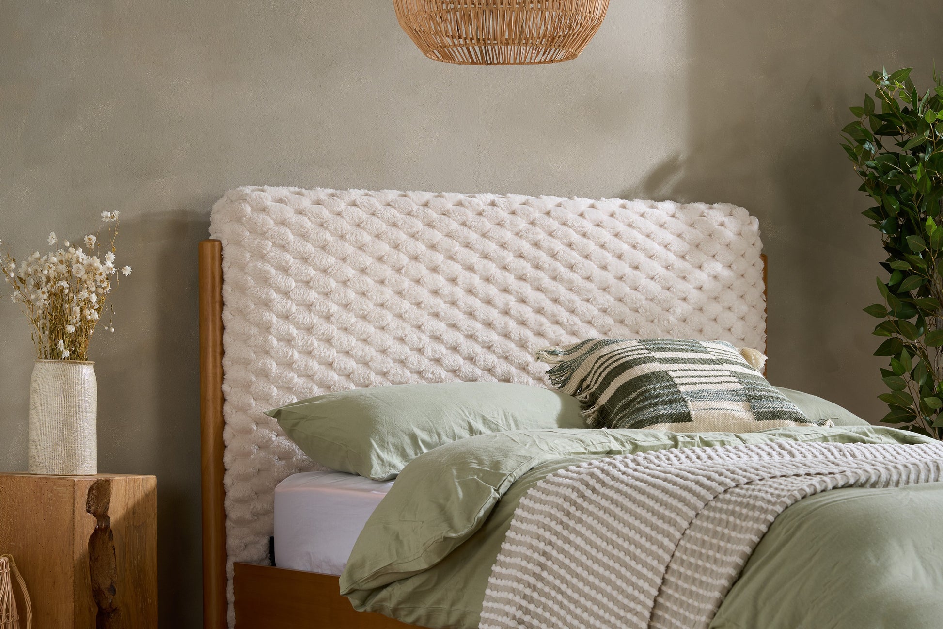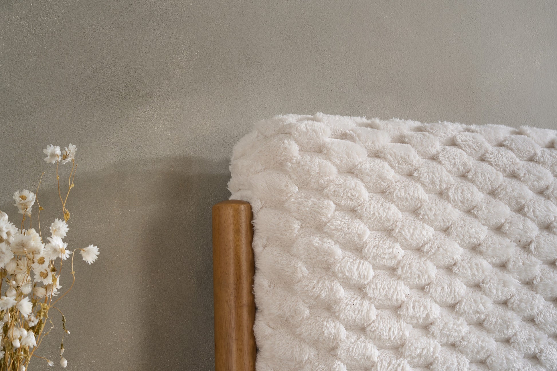 The bed features a natural wood frame that perfectly complements the softness of the faux fur, creating a harmonious blend of sleek modernity and unique elegance. The natural wood adds a touch of warmth and earthiness, balancing the luxurious texture of the faux fur headboard, making it a perfect choice for those who appreciate refined anaesthetics with a natural, grounded feel.