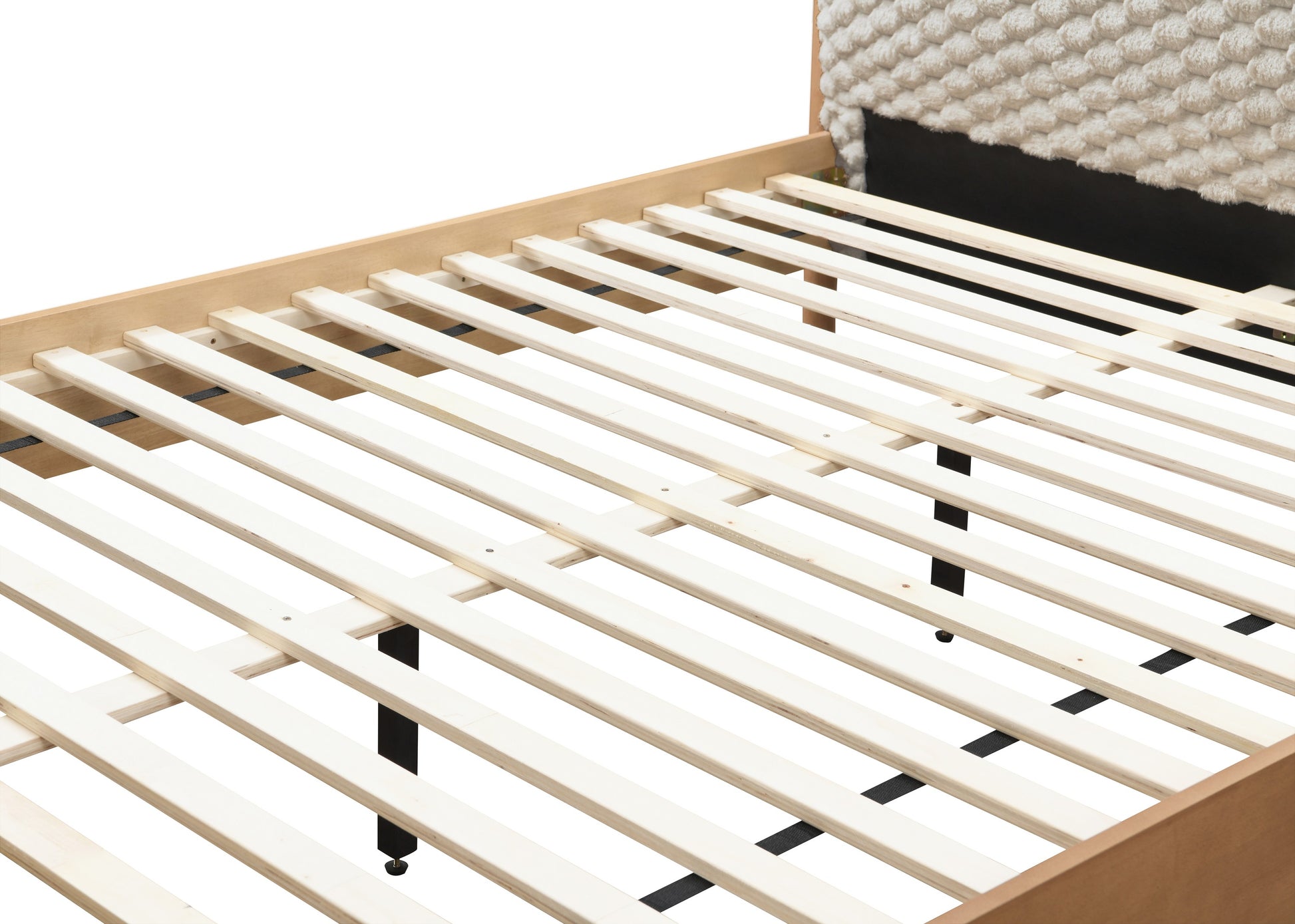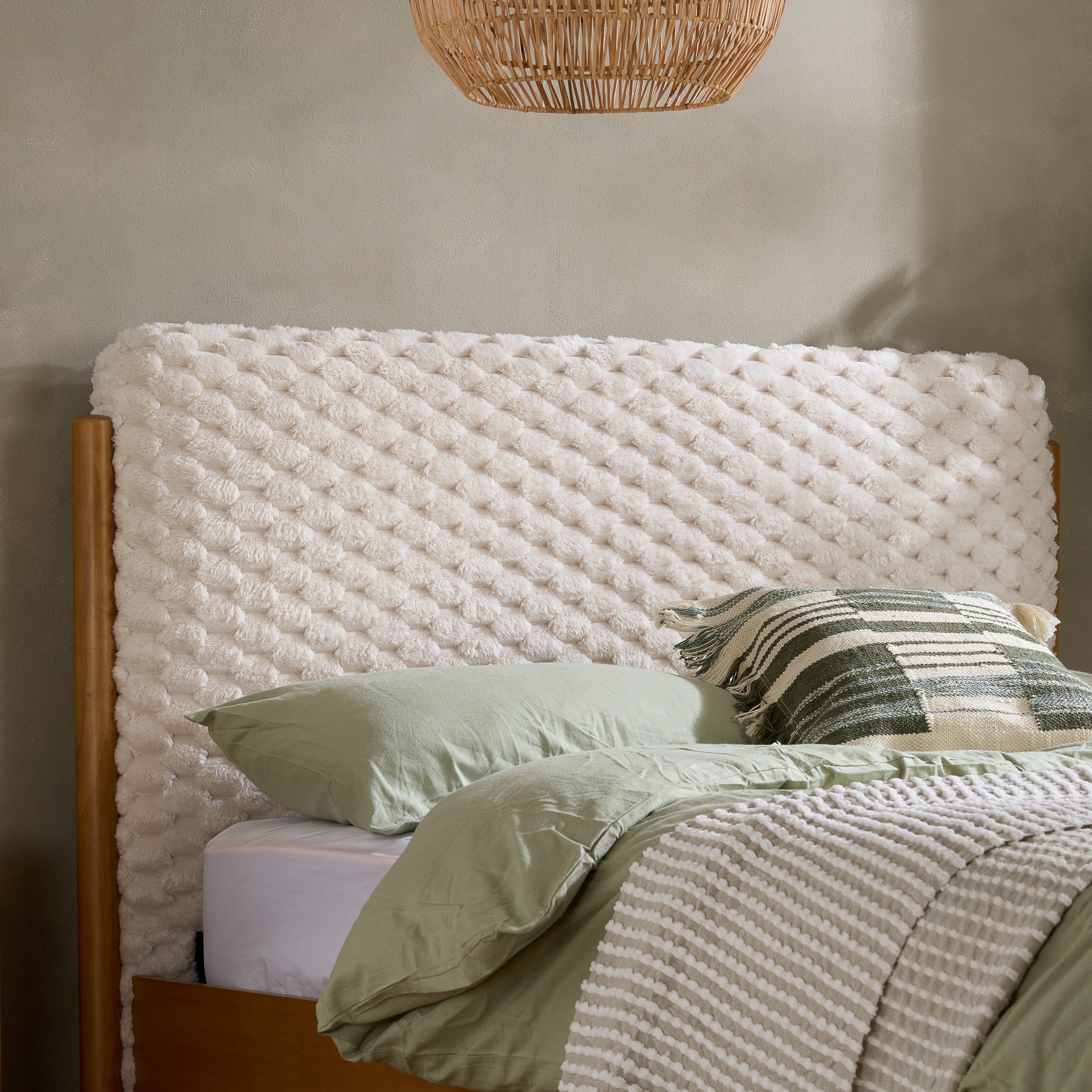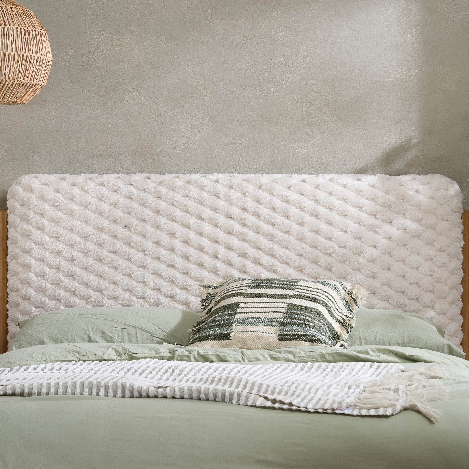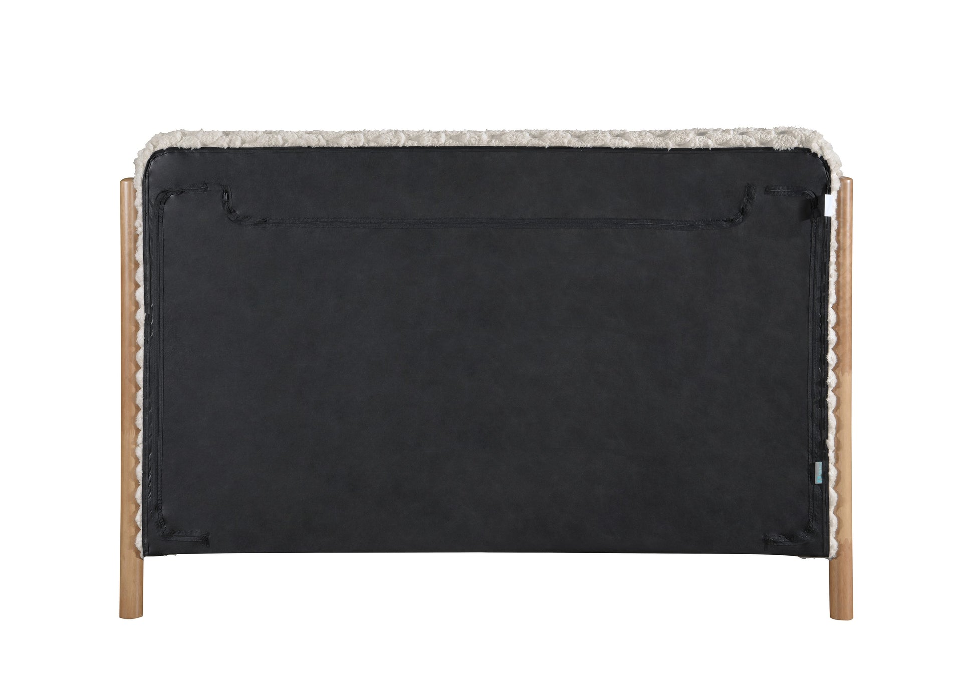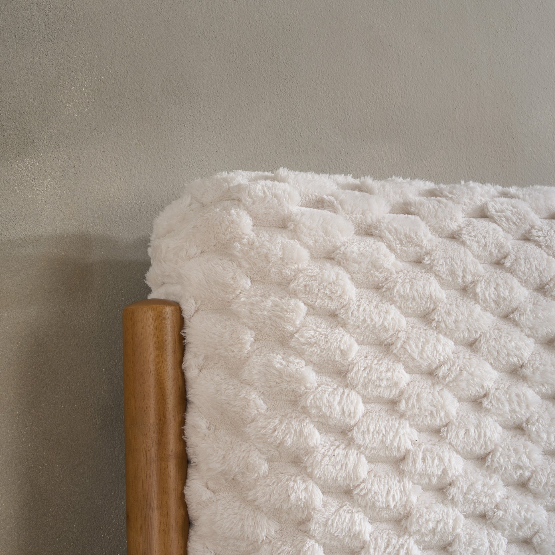 The bed features a natural wood frame that perfectly complements the softness of the faux fur, creating a harmonious blend of sleek modernity and unique elegance. The natural wood adds a touch of warmth and earthiness, balancing the luxurious texture of the faux fur headboard, making it a perfect choice for those who appreciate refined anaesthetics with a natural, grounded feel.