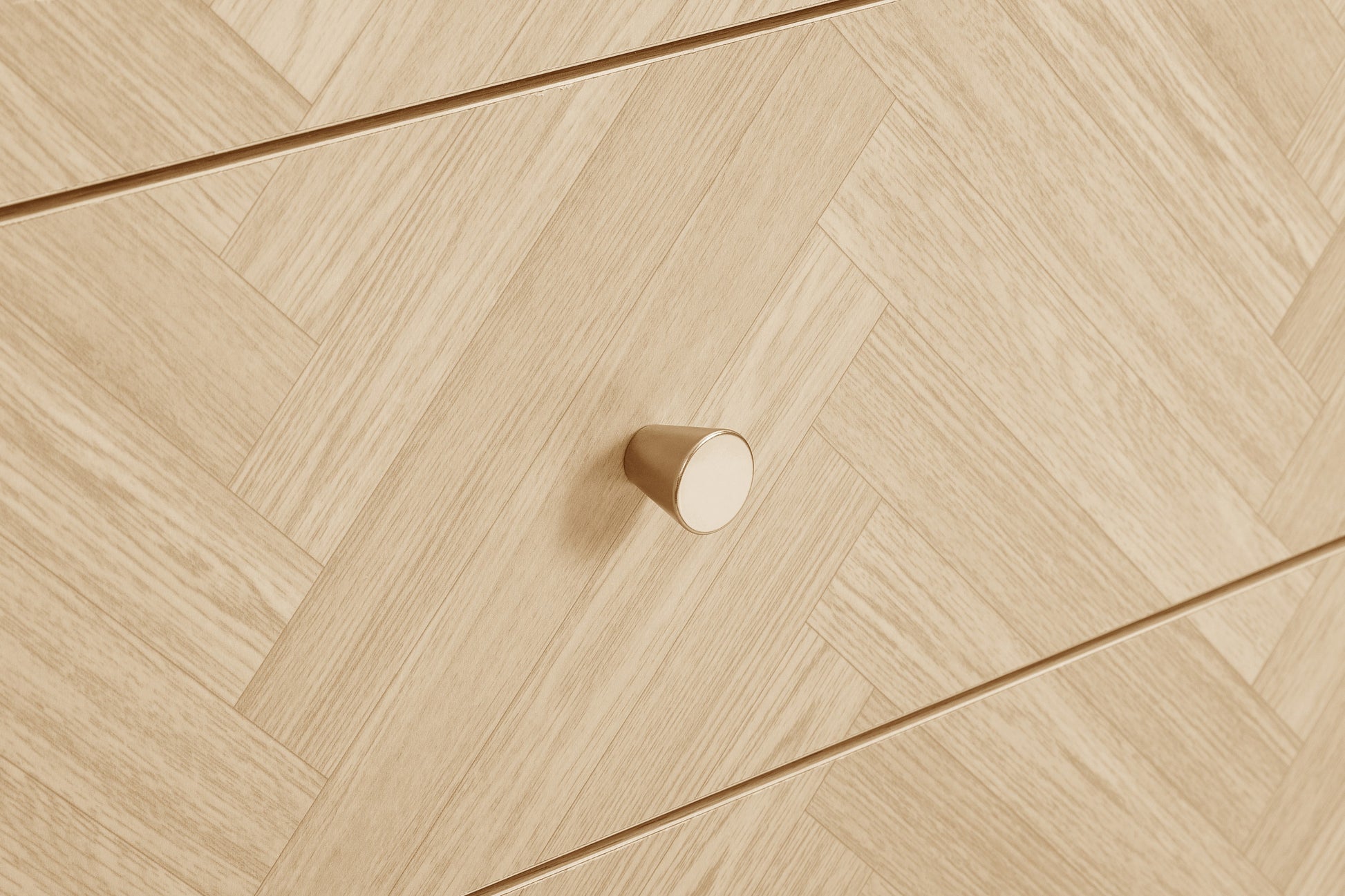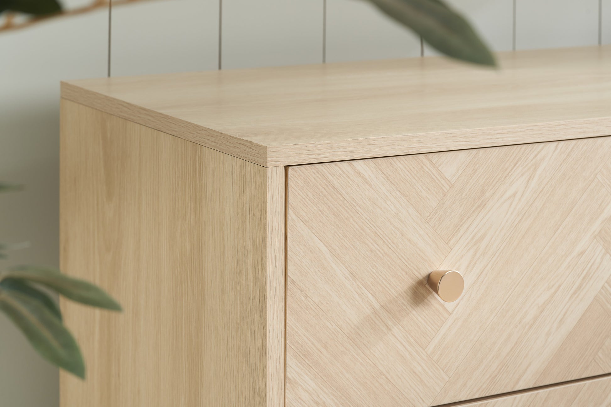 Inspired by the symmetry and precision of classic chevron patterns, the Herringford range brings an element of architectural finesse to your bedroom. Each piece is thoughtfully constructed from high-quality particleboard, finished with a laminated oak effect that captures the essence and visual warmth of real wood.