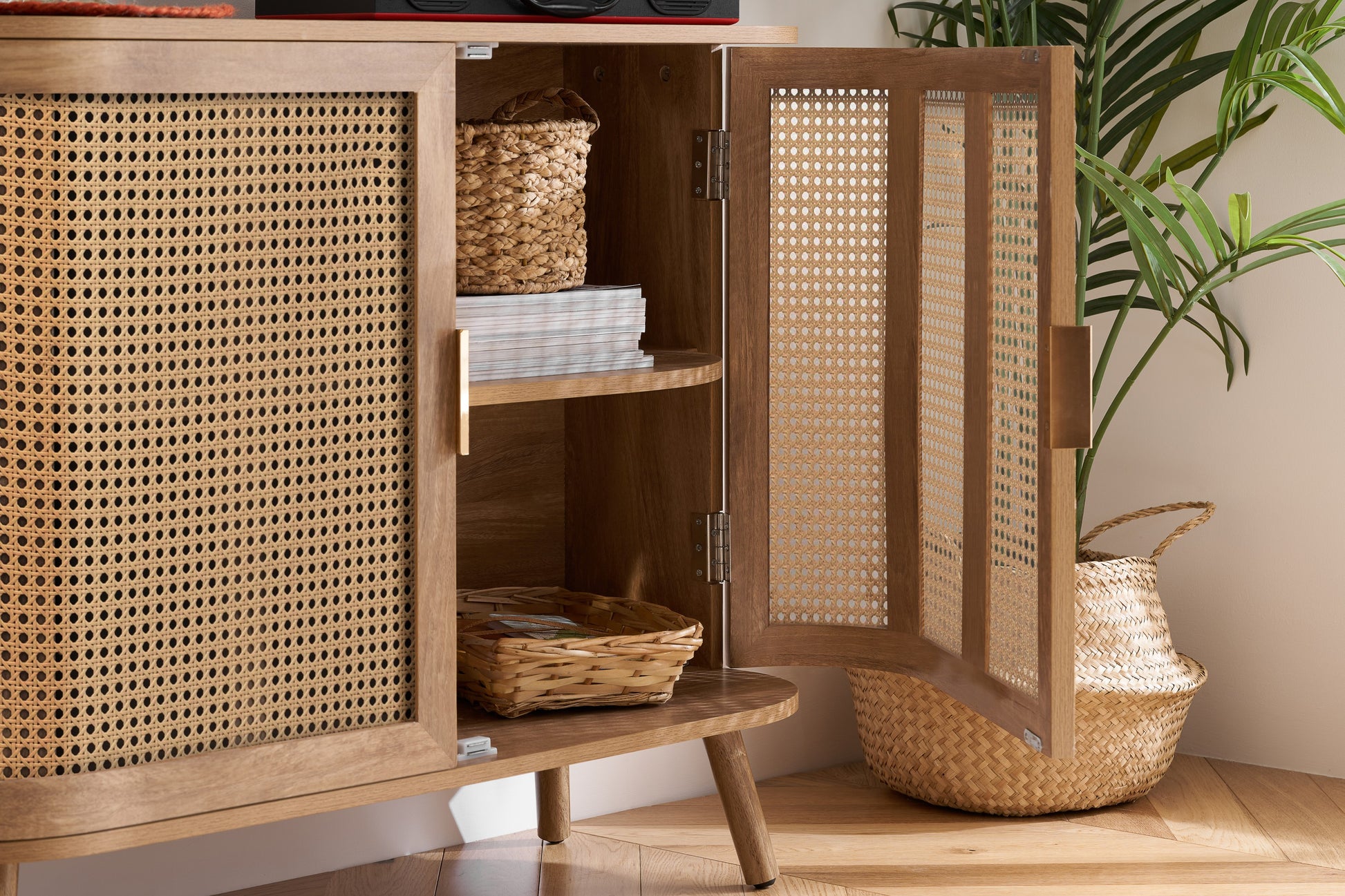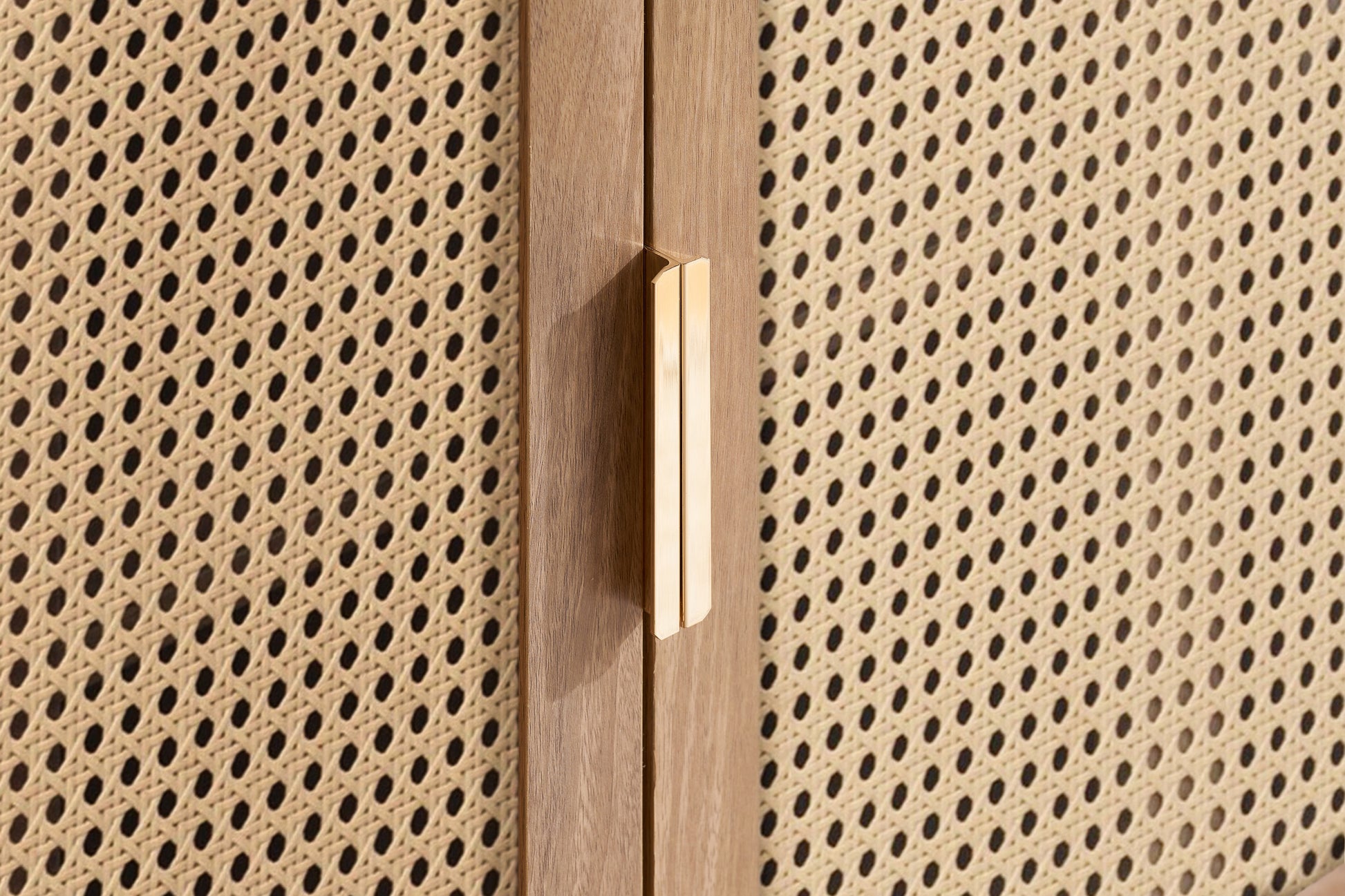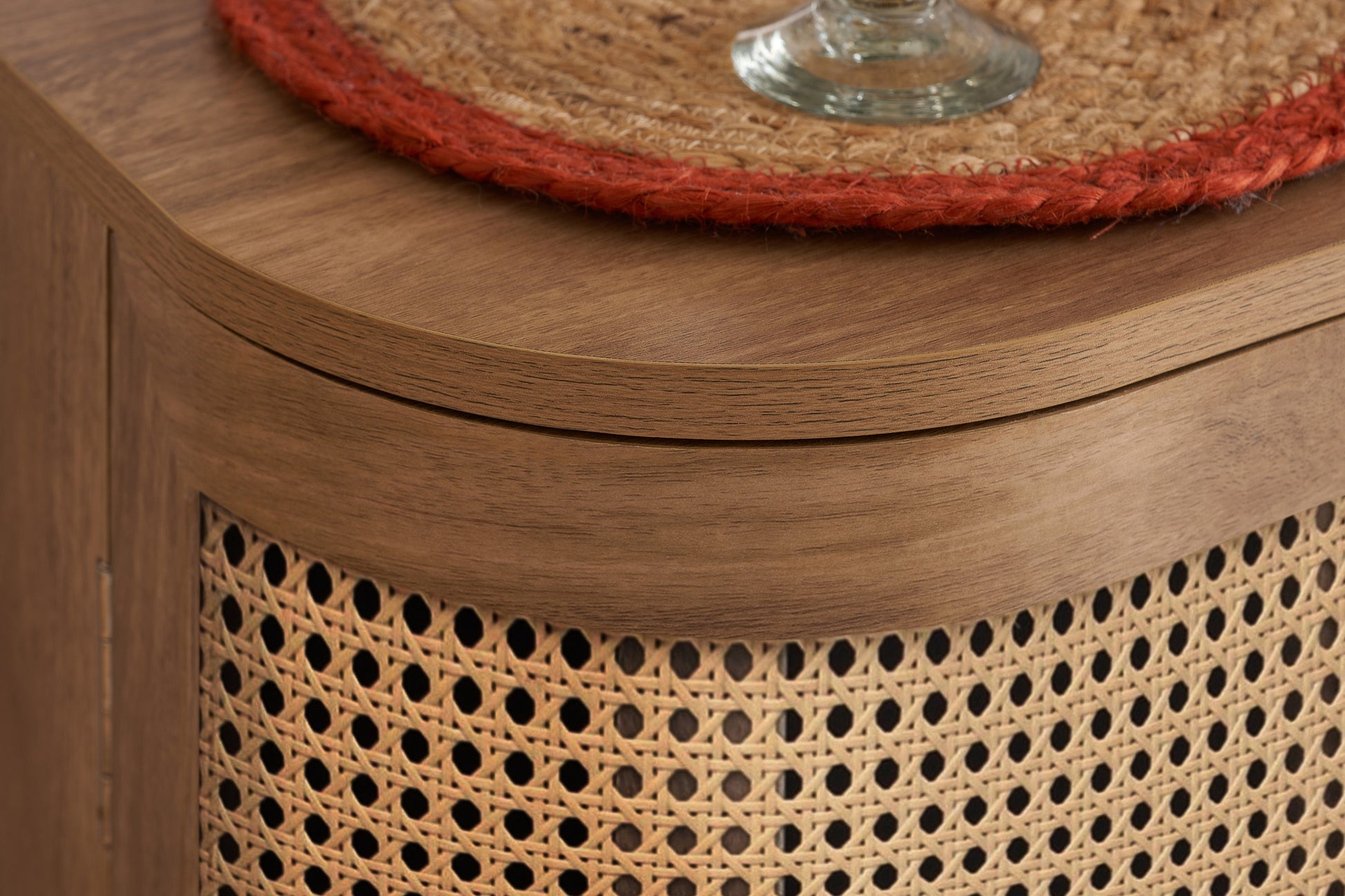 Each curve is thoughtfully softened, featuring delicate bevels that whisper a modern sensibility. The rattan front is meticulously woven, presenting a pattern that is both eye-catching and gracefully reserved. The warm, neutral palette ensures versatility, while the smooth wooden surfaces invite a tactile experience.