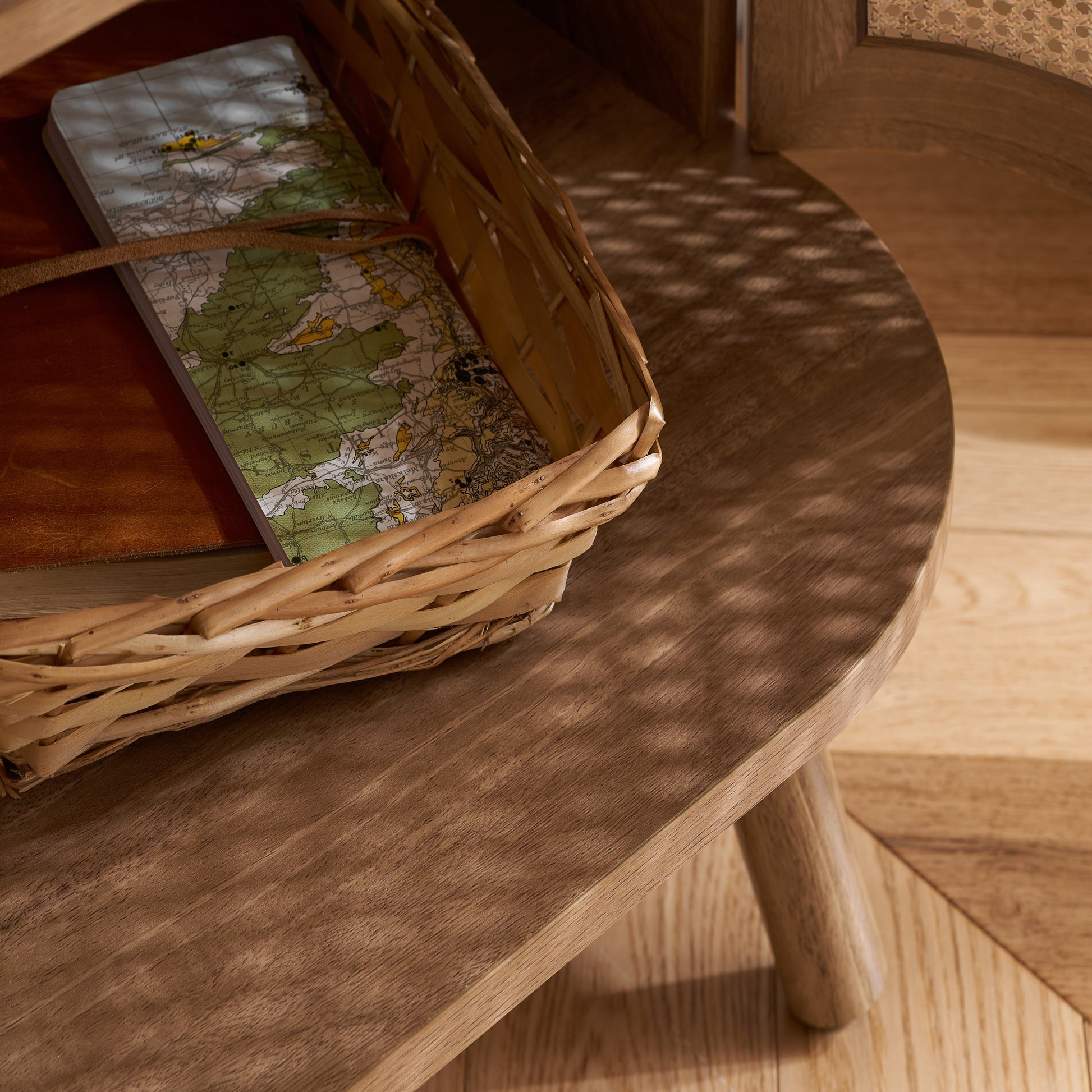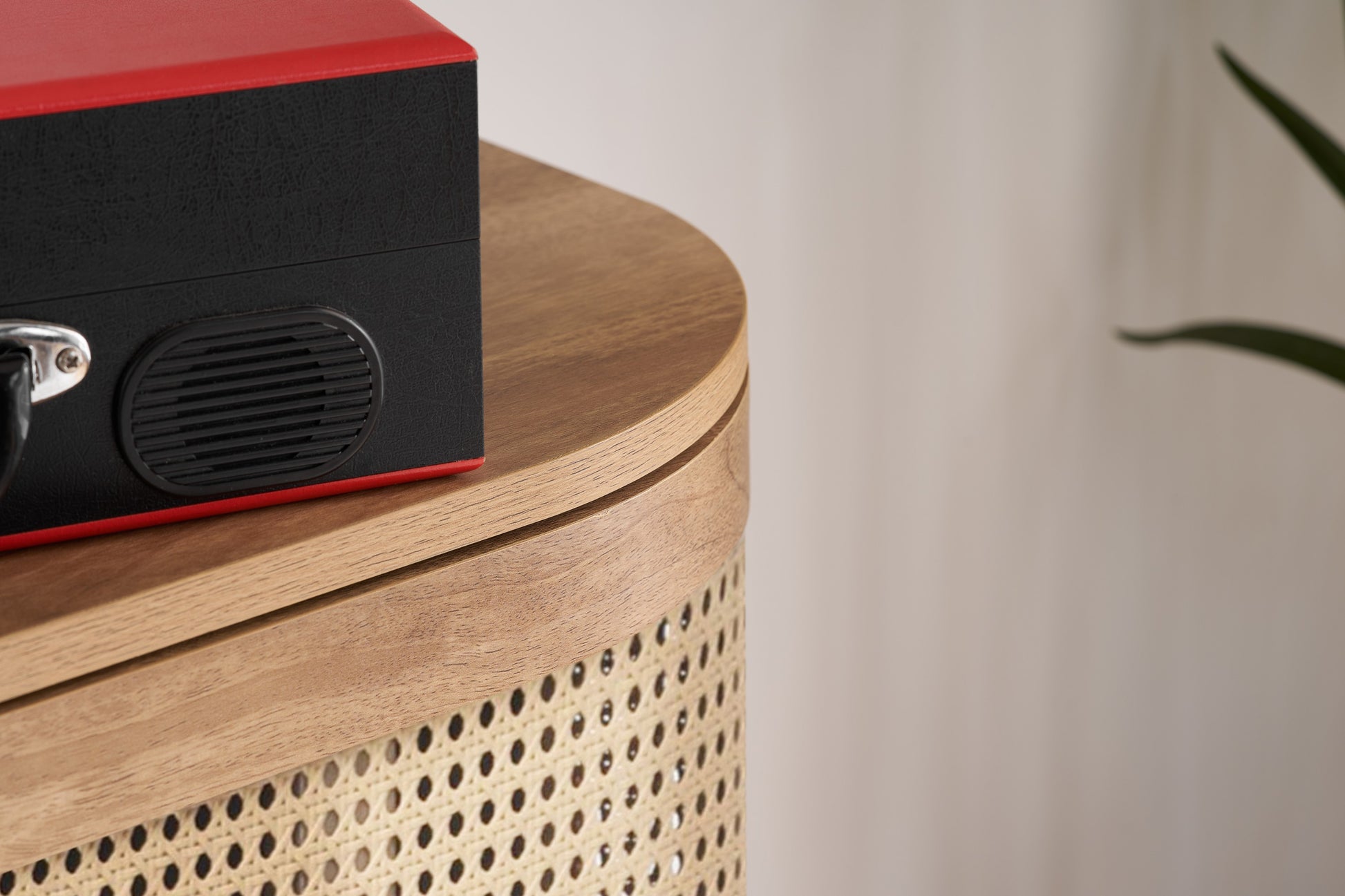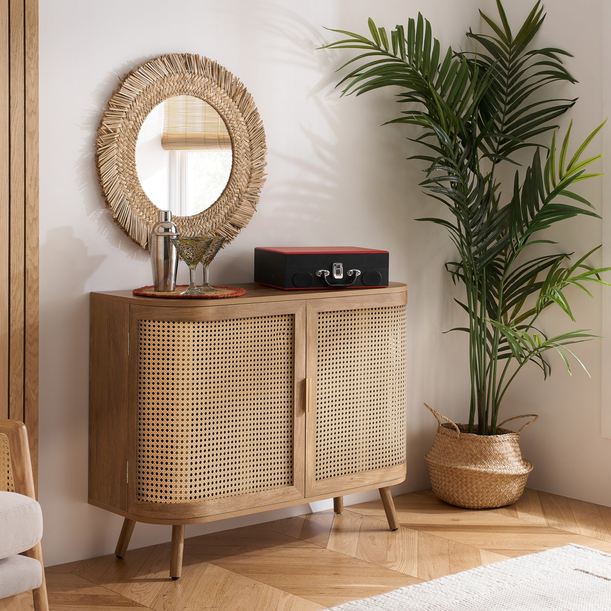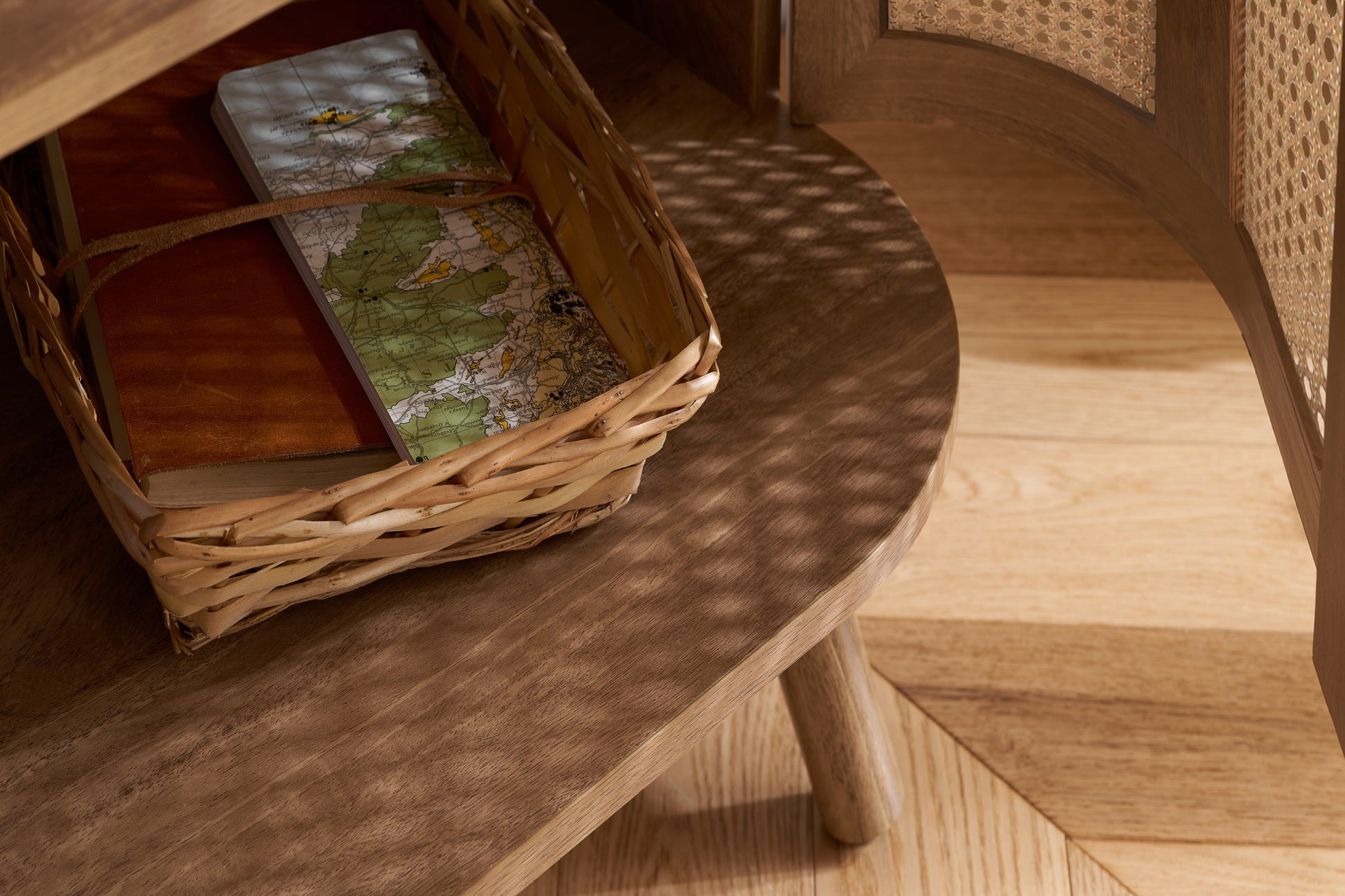 Each curve is thoughtfully softened, featuring delicate bevels that whisper a modern sensibility. The rattan front is meticulously woven, presenting a pattern that is both eye-catching and gracefully reserved. The warm, neutral palette ensures versatility, while the smooth wooden surfaces invite a tactile experience.