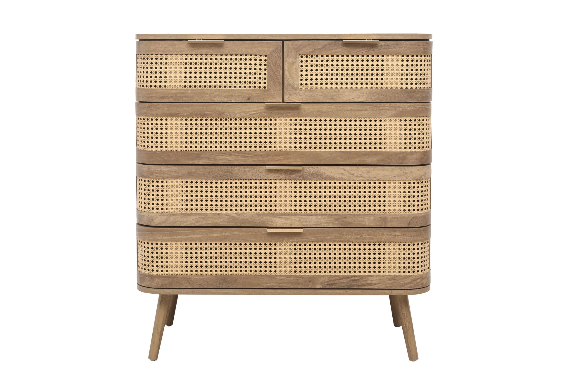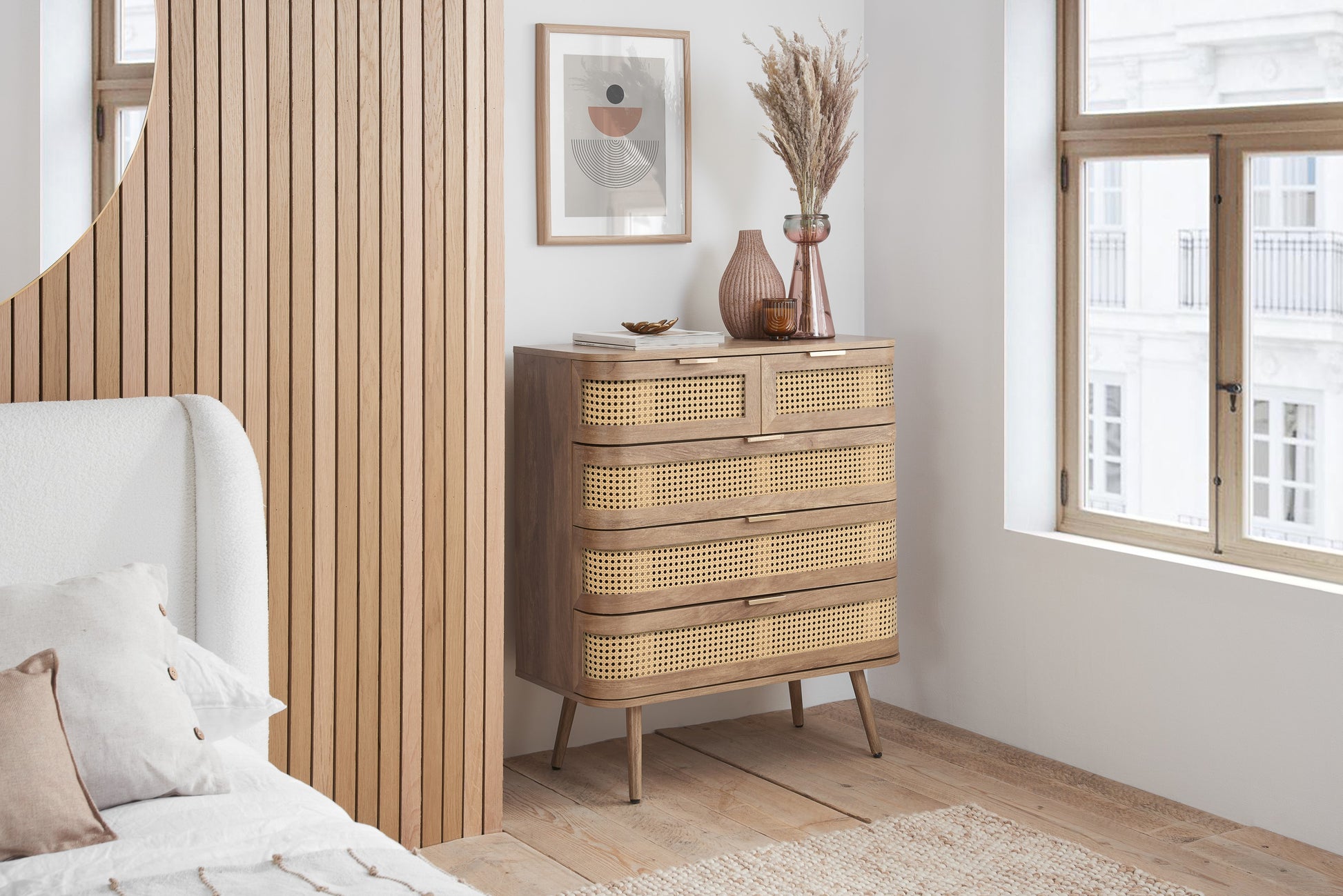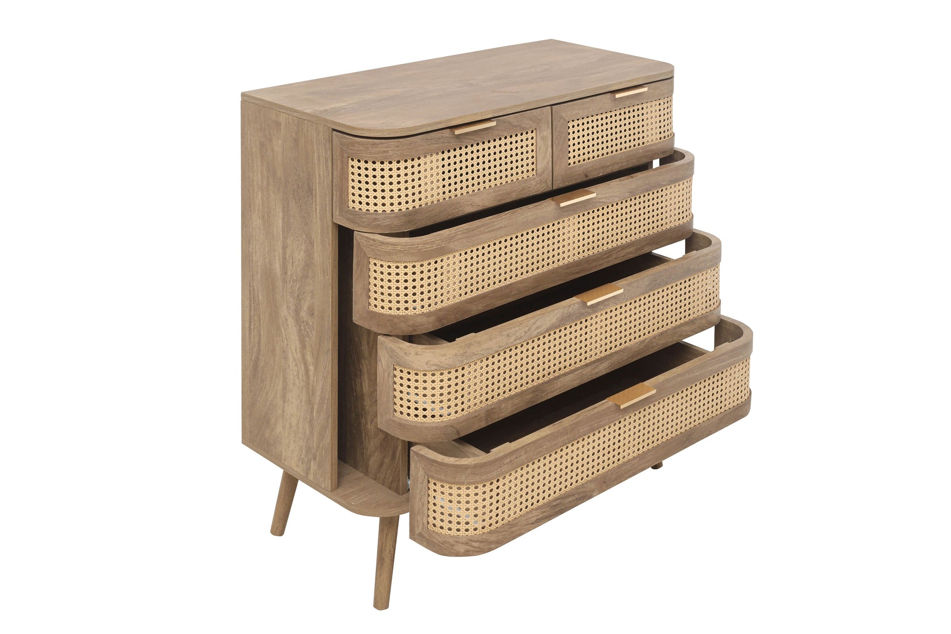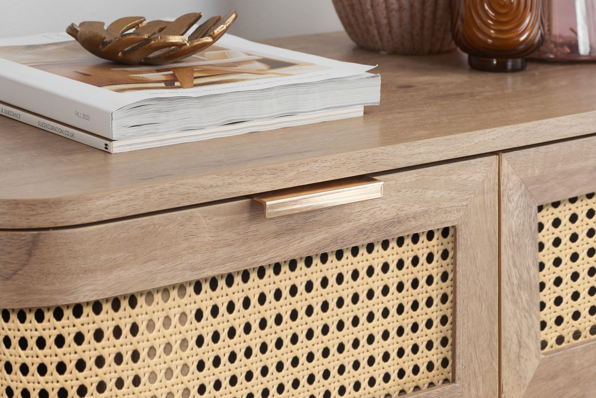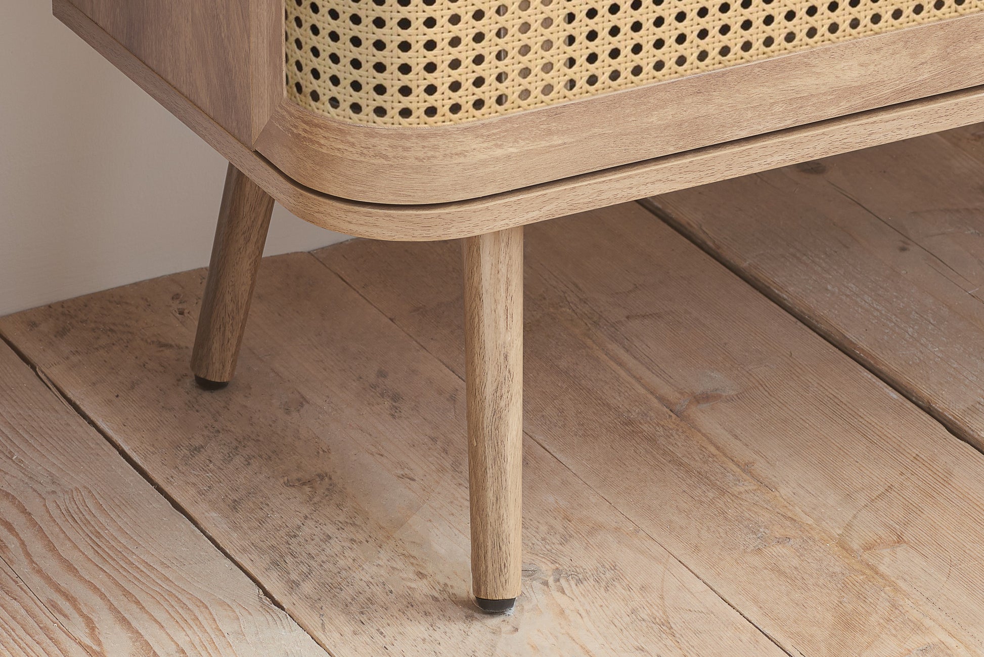 Each curve is thoughtfully softened, featuring delicate bevels that whisper a modern sensibility. The rattan front is meticulously woven, presenting a pattern that is both eye-catching and gracefully reserved. The warm, neutral palette ensures versatility, while the smooth wooden surfaces invite a tactile experience.