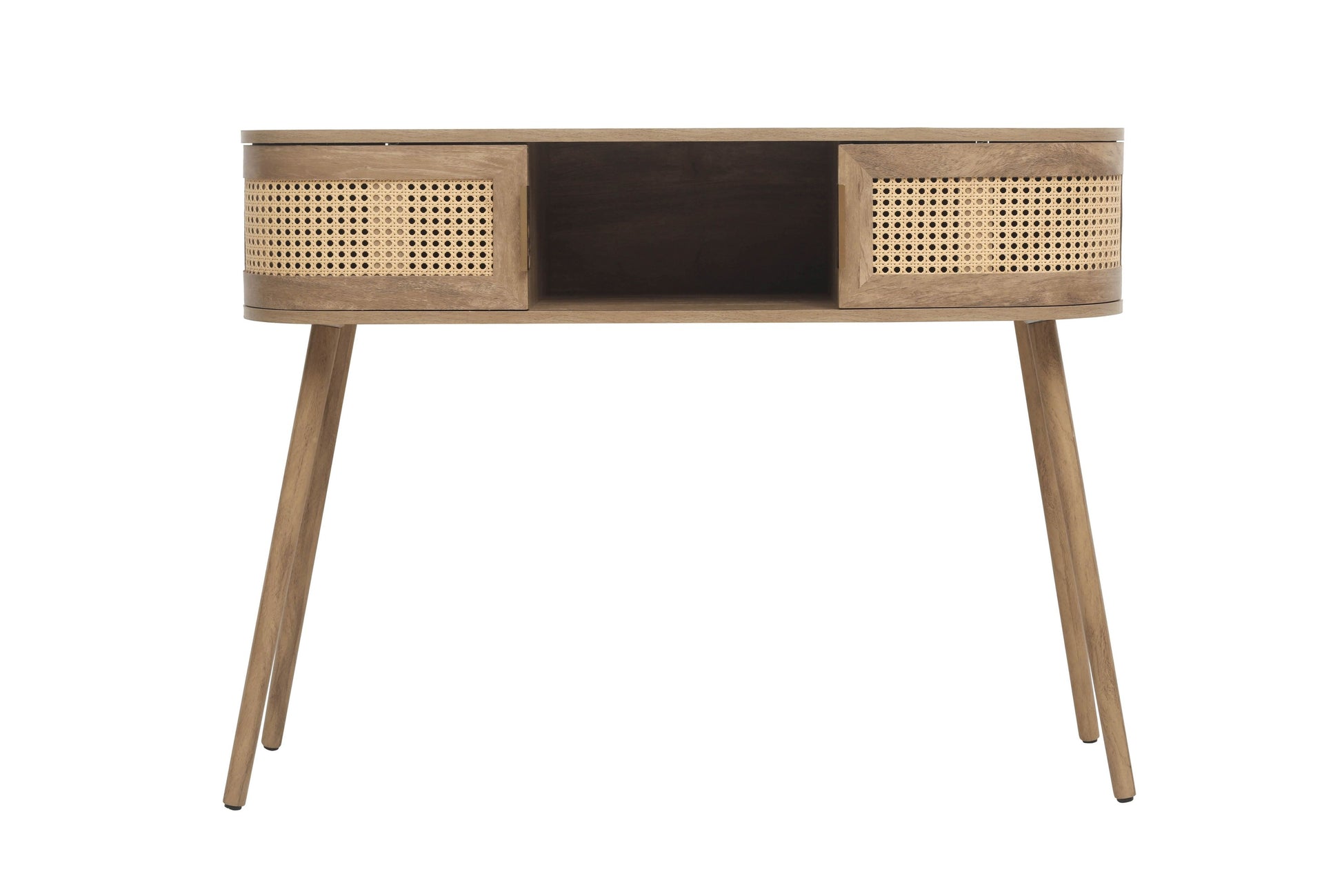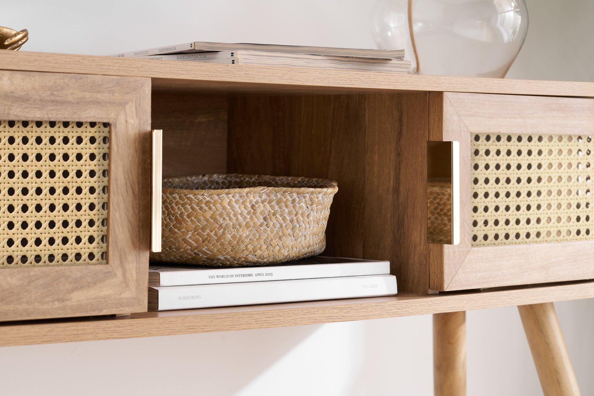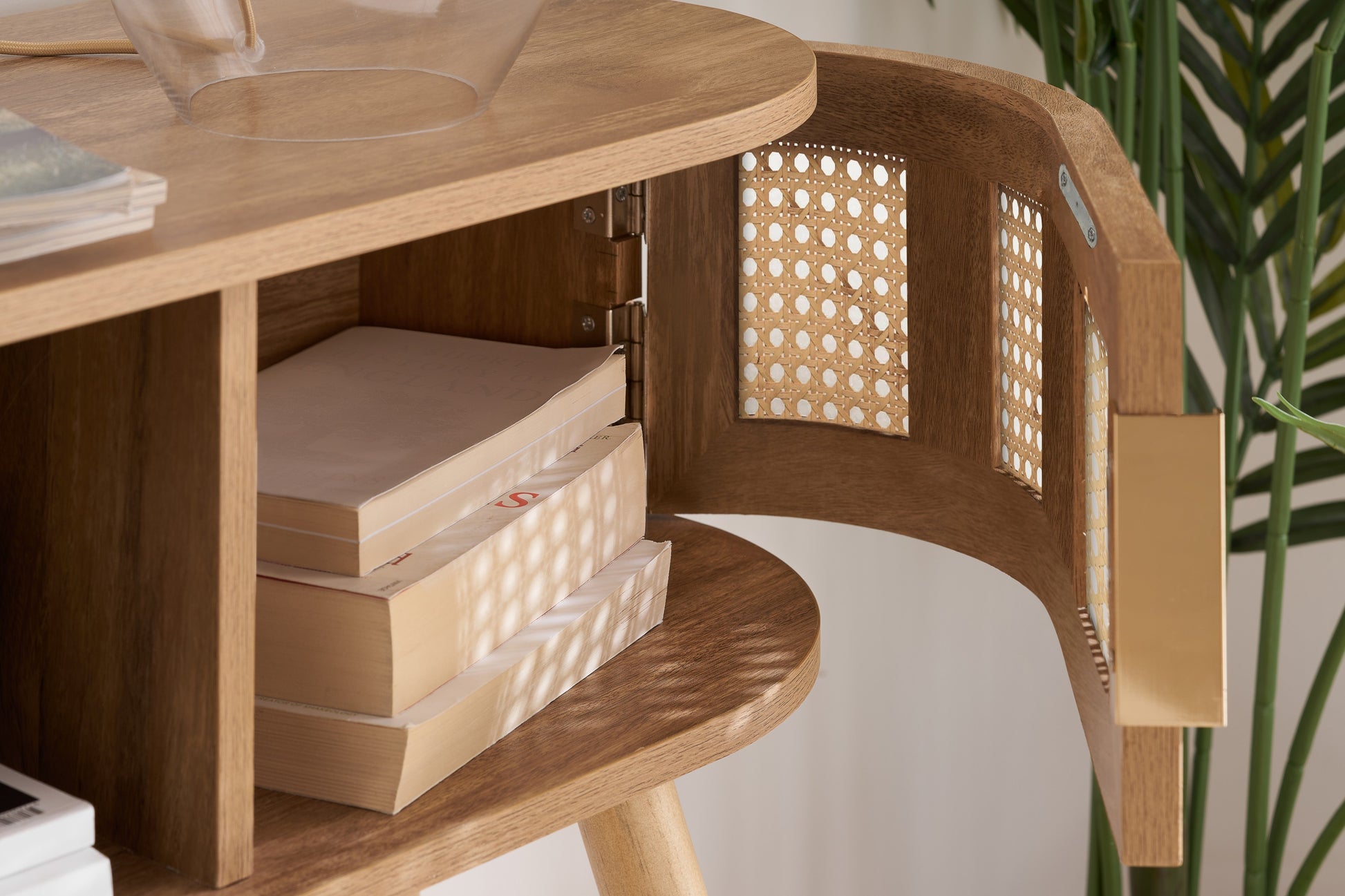 Each curve is thoughtfully softened, featuring delicate bevels that whisper a modern sensibility. The rattan front is meticulously woven, presenting a pattern that is both eye-catching and gracefully reserved. The warm, neutral palette ensures versatility, while the smooth wooden surfaces invite a tactile experience.