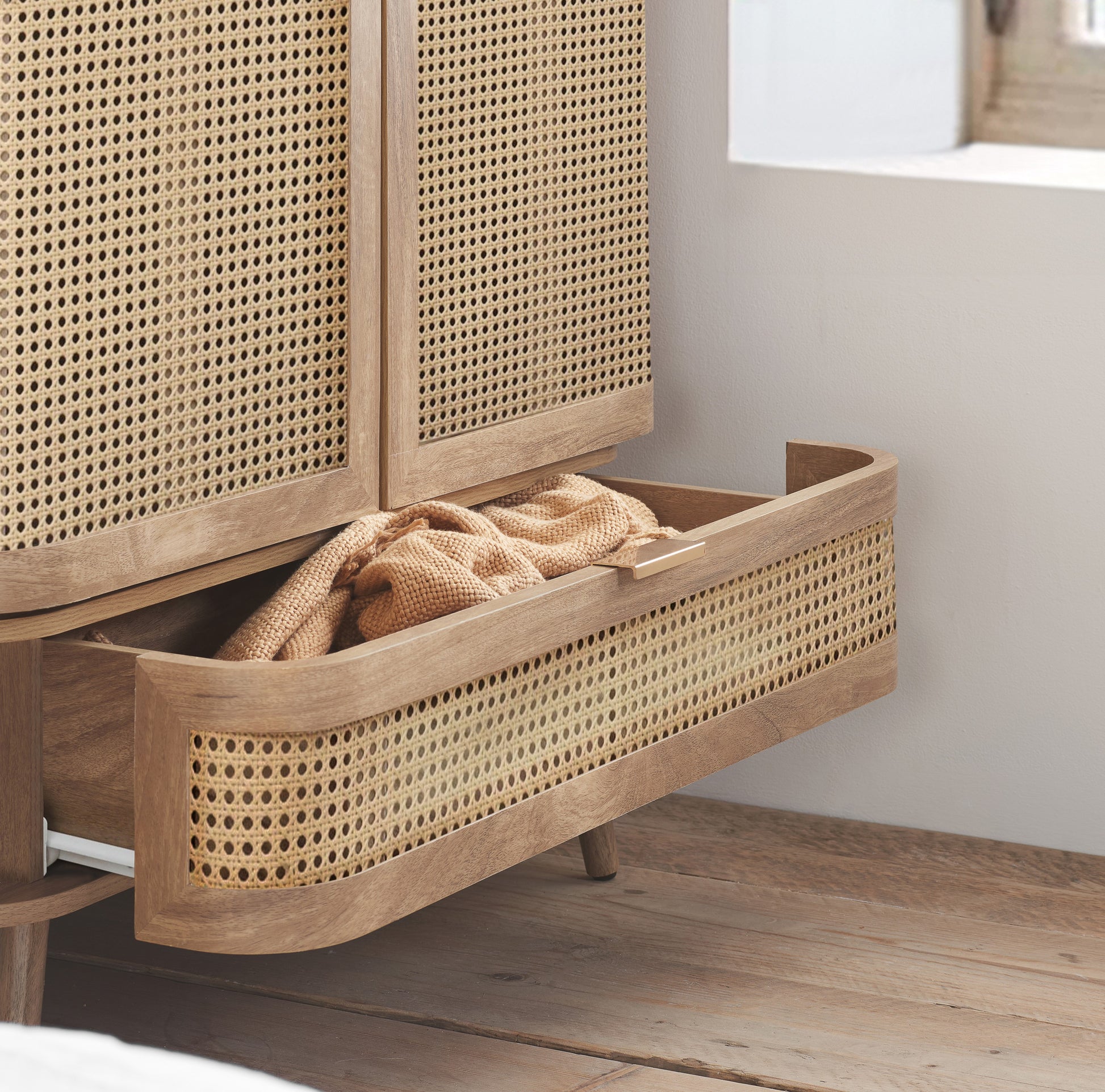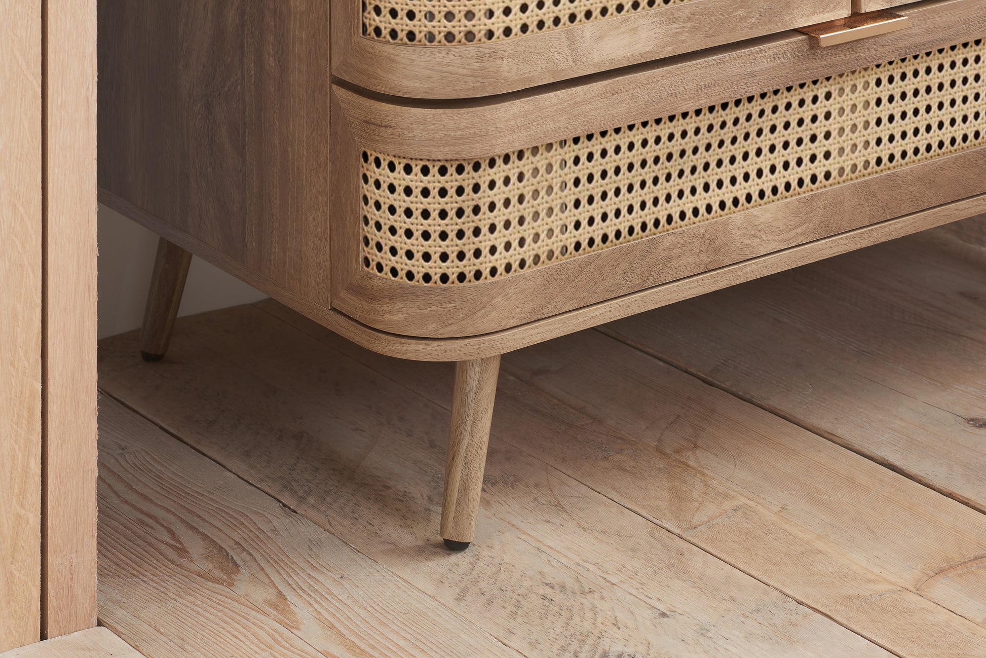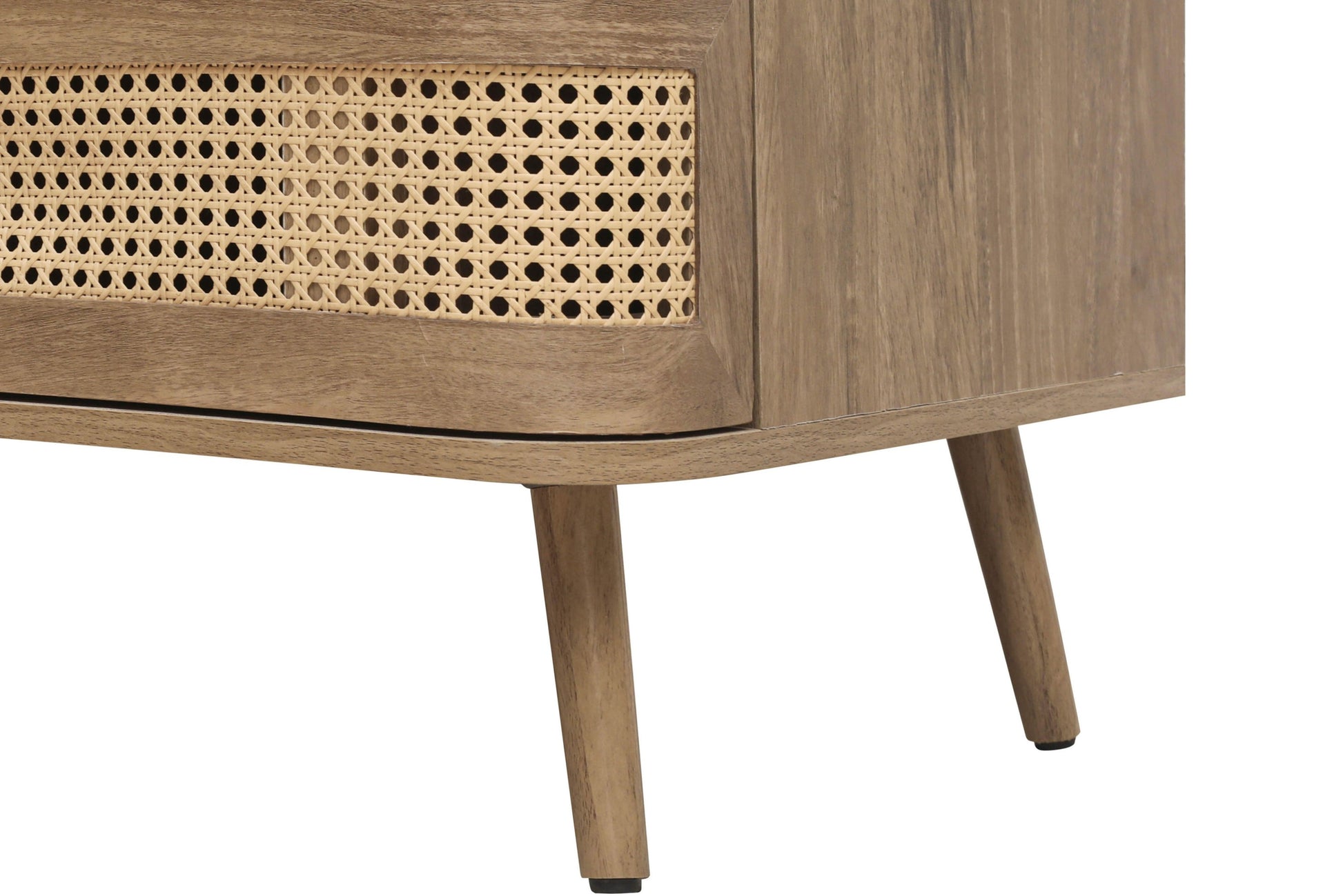 Each curve is thoughtfully softened, featuring delicate bevels that whisper a modern sensibility. The rattan front is meticulously woven, presenting a pattern that is both eye-catching and gracefully reserved. The warm, neutral palette ensures versatility, while the smooth wooden surfaces invite a tactile experience.