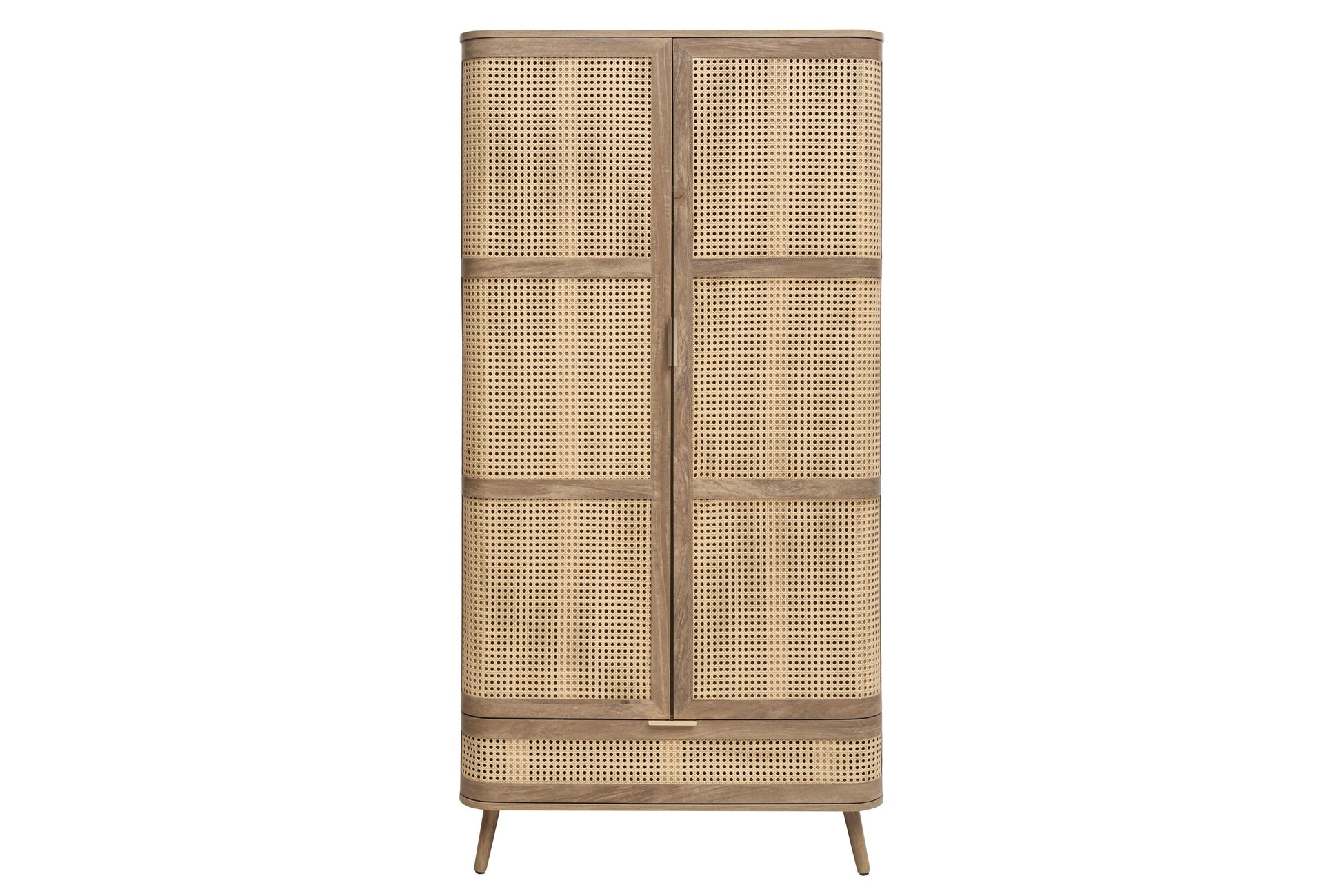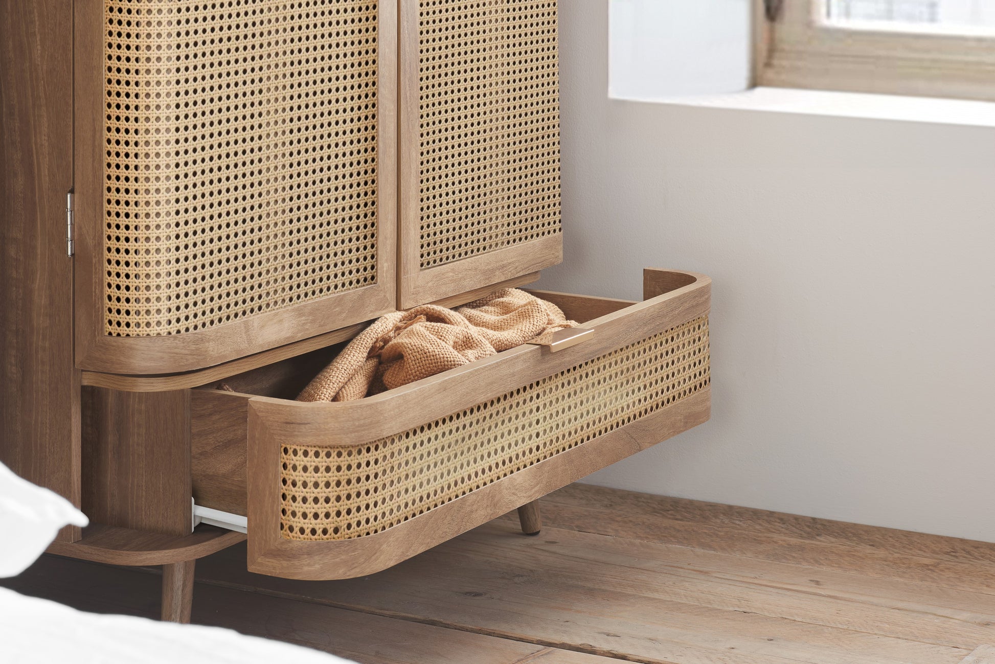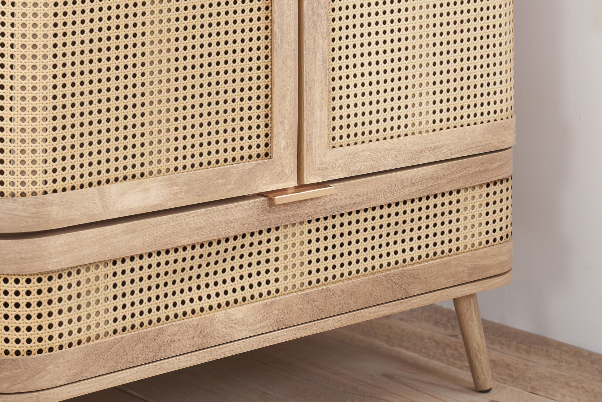 Each curve is thoughtfully softened, featuring delicate bevels that whisper a modern sensibility. The rattan front is meticulously woven, presenting a pattern that is both eye-catching and gracefully reserved. The warm, neutral palette ensures versatility, while the smooth wooden surfaces invite a tactile experience.