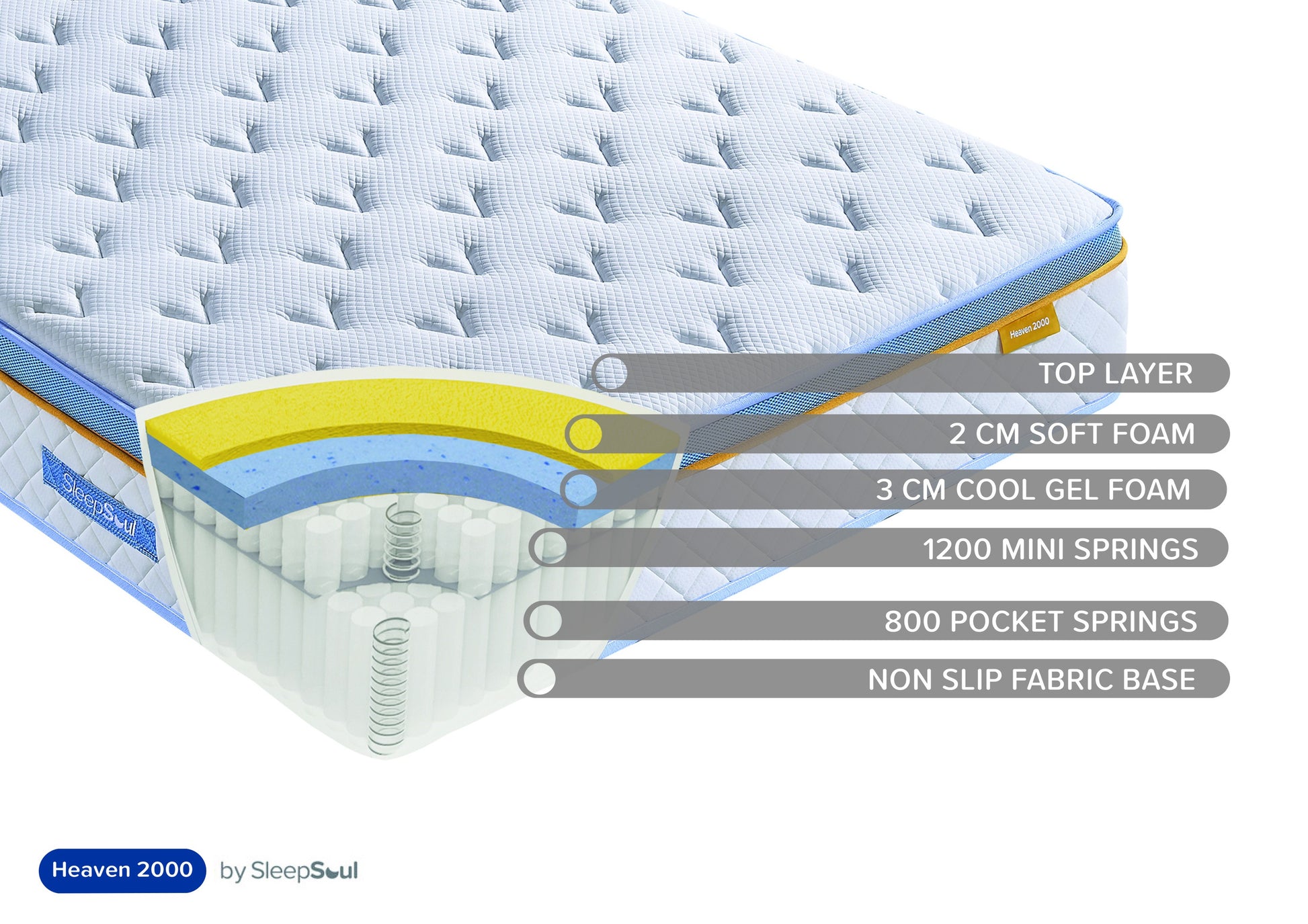 Welcome to the SleepSoul Heaven 2000, where innovative design meets the ultimate in sleeping comfort. This mattress combines 800 individual pocket springs with layers of soft and coolgel foam, delivering a sleep experience that feels like floating on air.