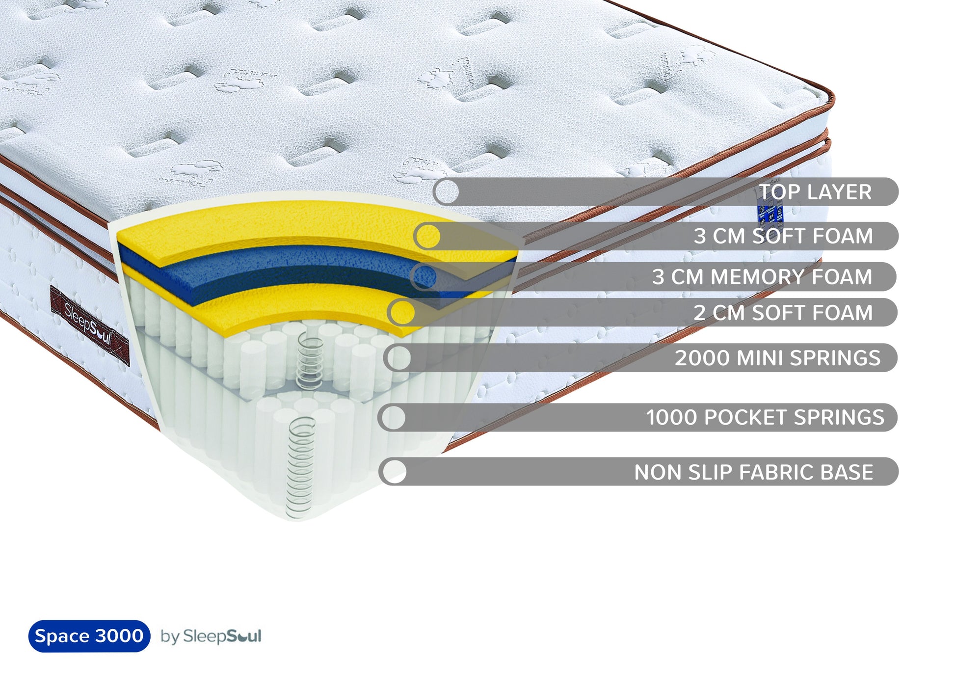 The SleepSoul Space 3000 mattress invites you into a world where luxury meets unparalleled support. Designed for those who demand the best in sleep technology and materials, this mattress offers a celestial sleeping experience night after night.