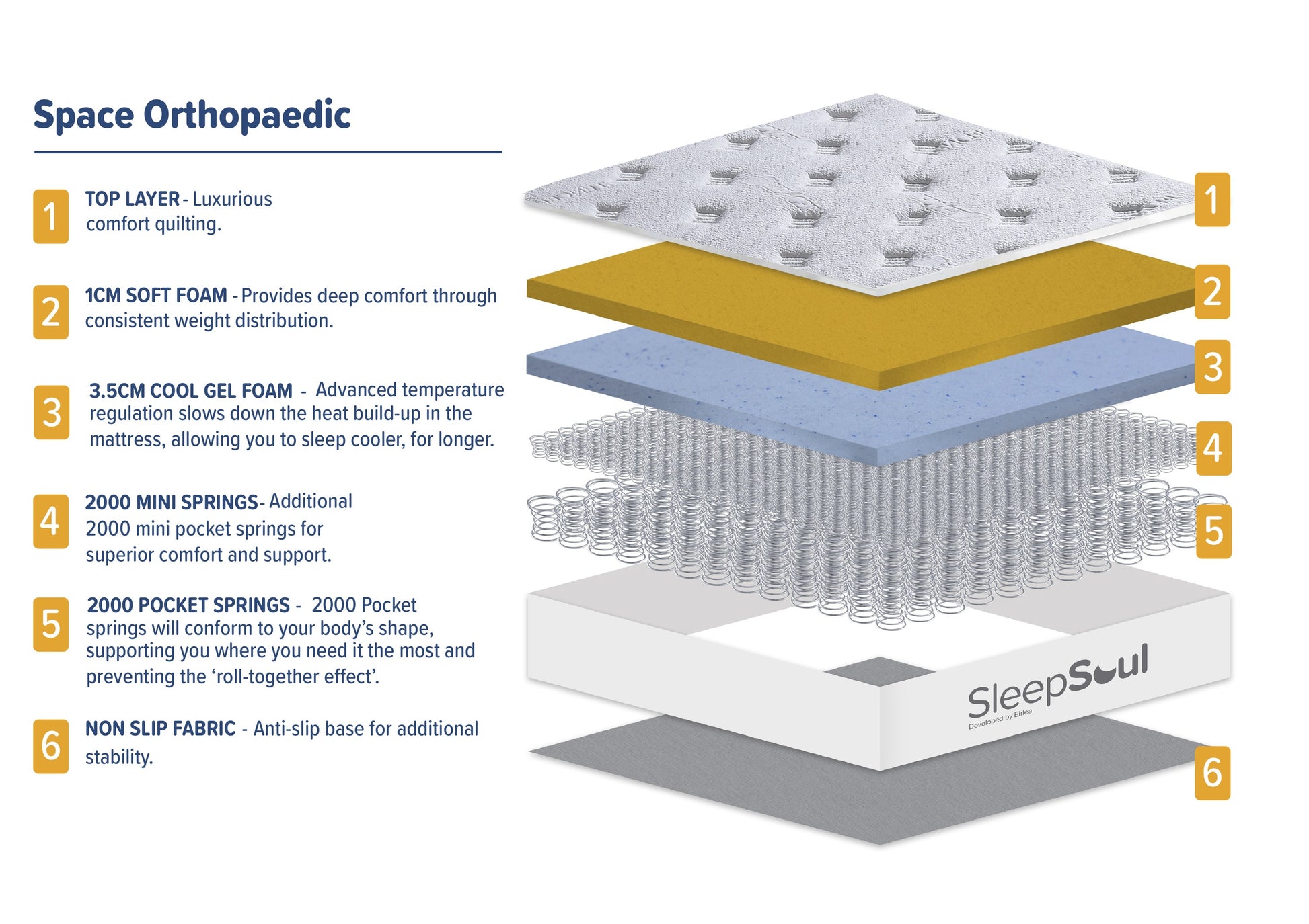 The SleepSoul Space Orthopaedic mattress delivers an exceptional blend of orthopaedic support and luxurious comfort. Tailored for those seeking relief and a superior sleep experience, this mattress combines advanced design with premium materials.