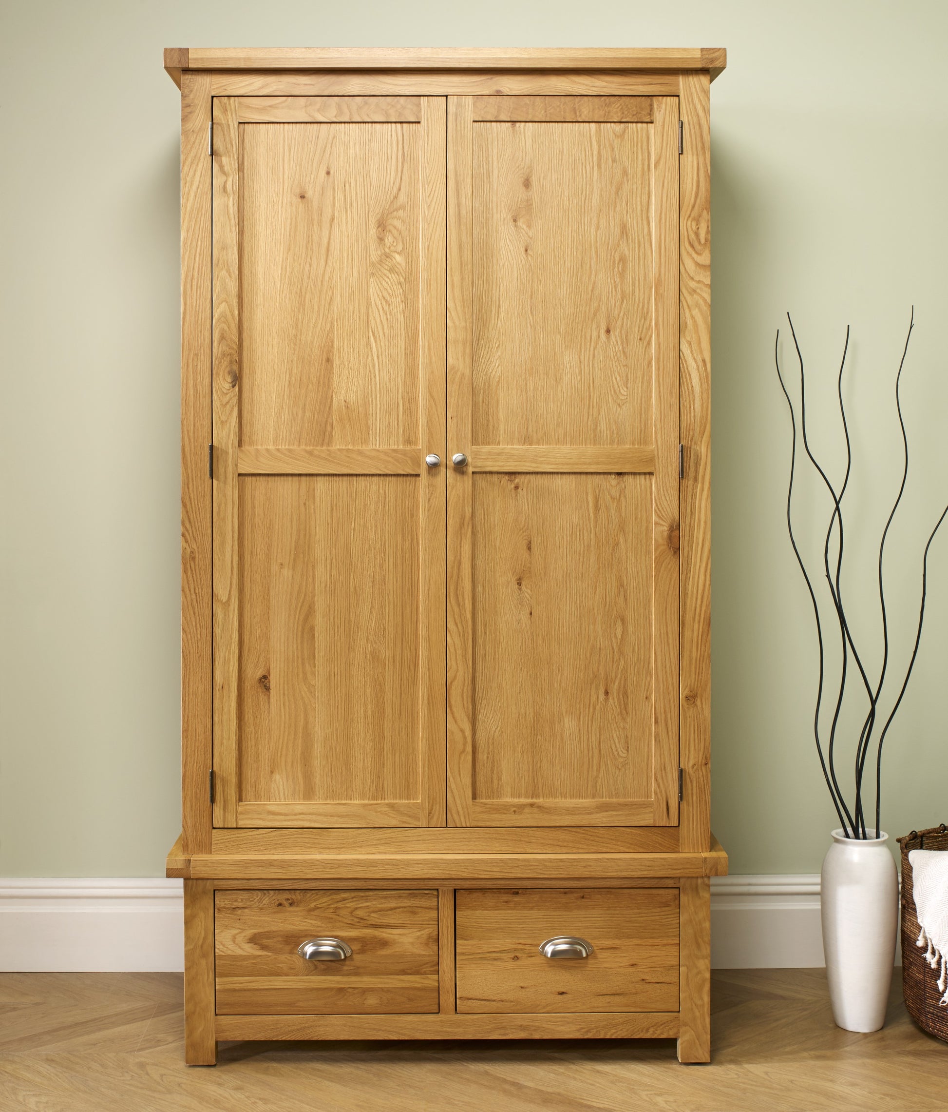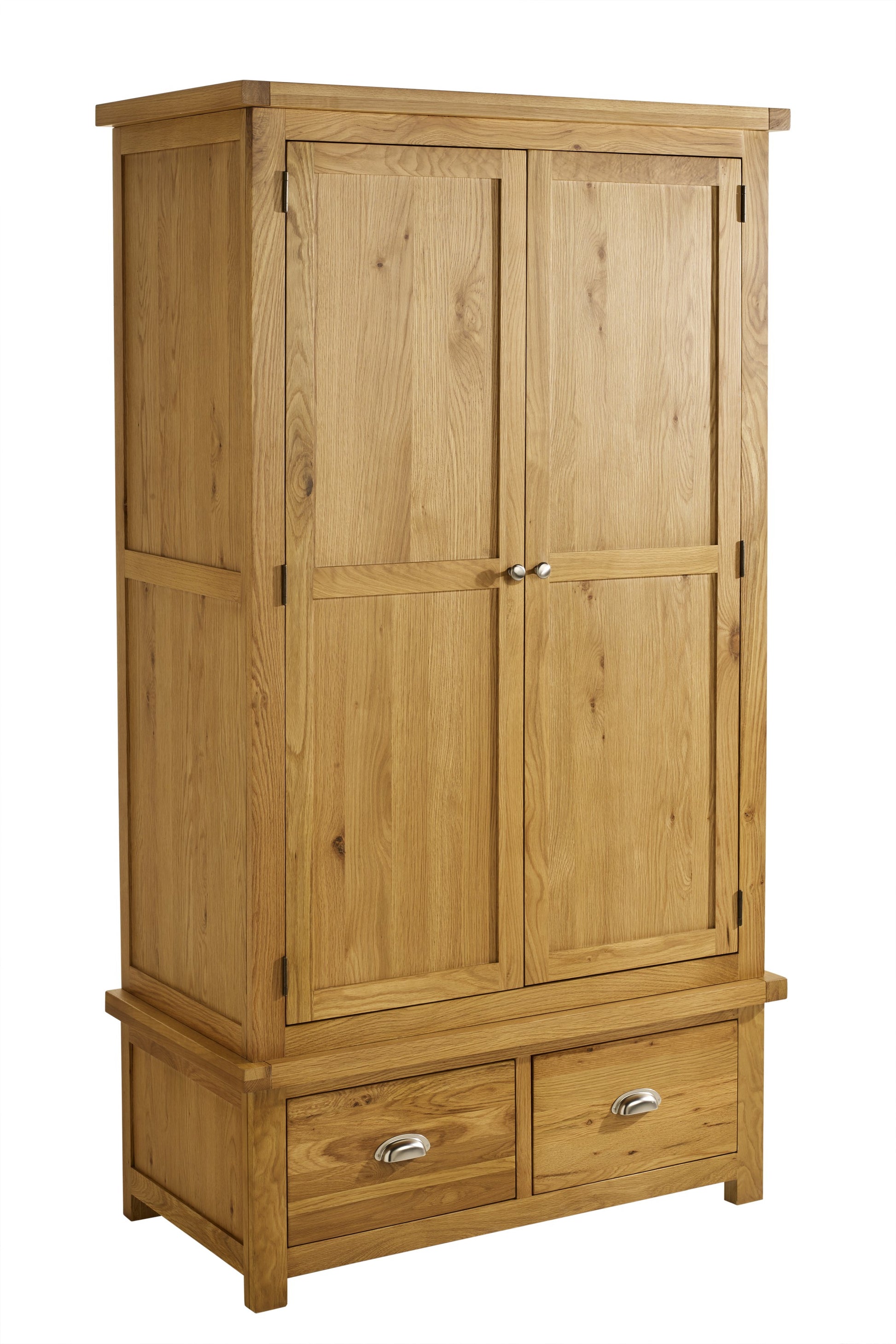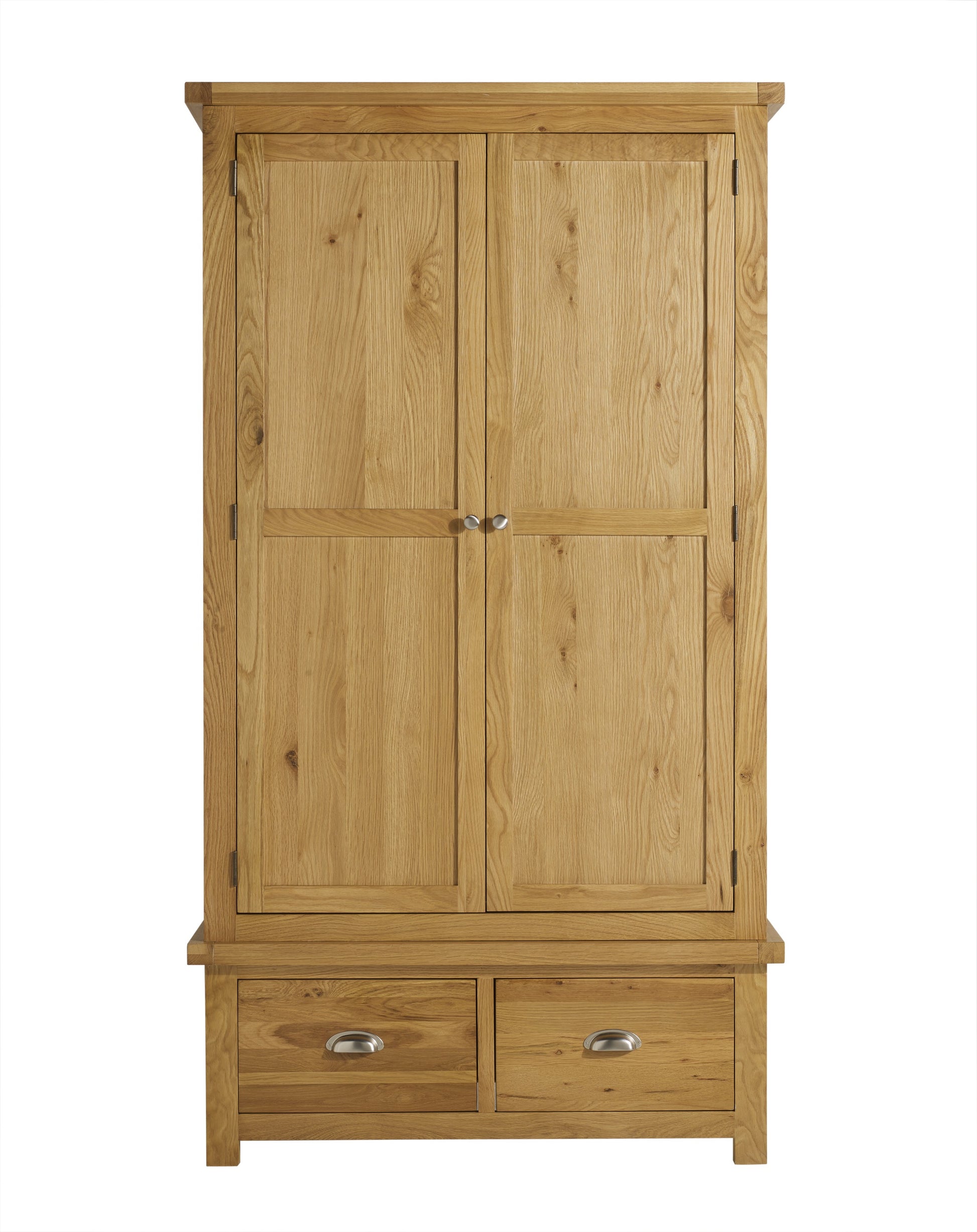 This practical wardrobe is spacious behind sturdy oak double doors, including two bottom drawers, perfect for the additional storage you need.