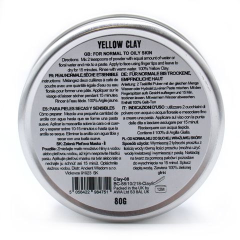 French Yellow Clay draws out impurities via the skin, detoxifying and helping decongest blocked pores, essential minerals within the clay are released helping heal and repair the skin. It helps stimulates blood circulation to the skin, tonifies and exfoliates gently